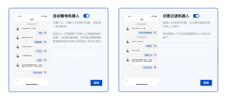 百度基木鱼客服机器人体系中,「自动套电机器人」、「访客过滤机器人」在生成式AI能力的加持下也做到了业界领先。「自动套电机器人」可全面代替人工7*24小时无休值守,时刻获客,有效解决客服人力紧张,夜间、假期无人接待问题,避免线索流失,实现流量利用最大化。「访客过滤机器人」可代替人工优先接待,秒级响应、精准引导开口并过滤不符合业务诉求的用户,全时段全场景辅助人工客服,大幅提升人工效率。