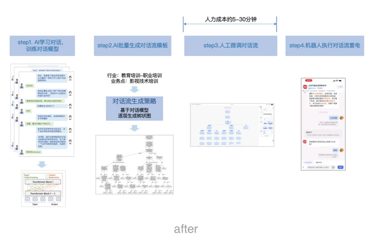 在百度领先的自然语言理解ERNIE模型技术支持下,AI可以精准理解用户需求意图,机器人客服秒级回复准确率高达99%,全天24小时在线避免线索流失,还可优先接待优质线索,提升高价值线索筛选能力。并根据不同行业不同业务个性化生成模版,相比人工编写预设模板,将时间成本从2天压缩到5-30分钟,时间节约100倍以上。