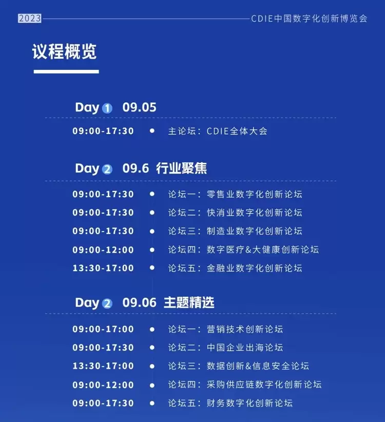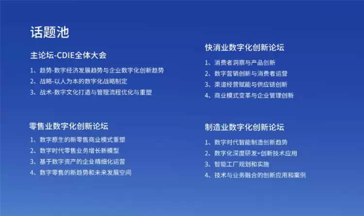 CDIE峰会不仅能帮助企业向外探索,在细分行业中找准数字化定位,更是能向内洞察,通过数字化运用对自有部门进行重塑,构建具有前瞻性的业务模式,帮助企业始终站在业界前沿。针对不同行业、企业、人群的数字化需求和视角,此次CDIE峰会开设5大行业论坛+5个主题论坛,包括:零售业数字化论坛、快消业数字化论坛、制造业数字化论坛、金融业数字化、数字医疗、营销数字化、财务数字化、采购供应链数字等。