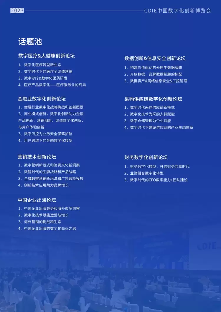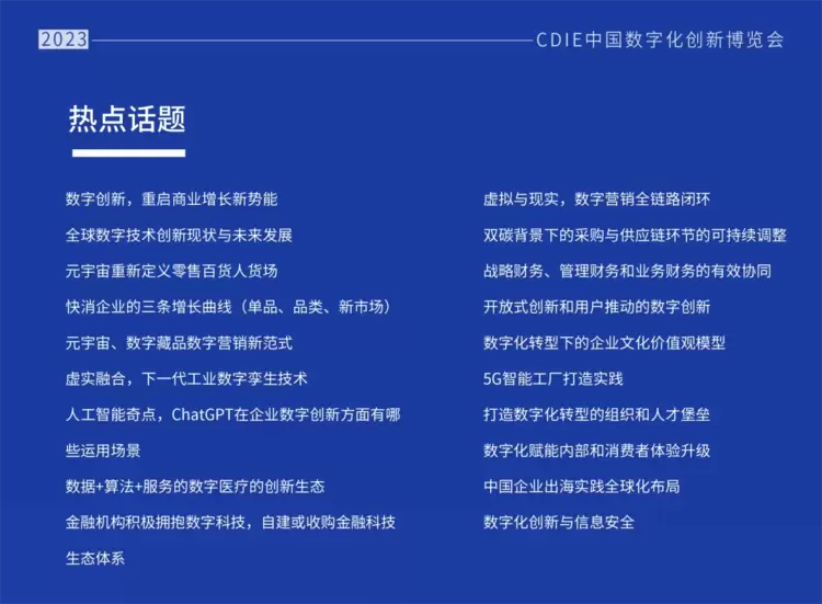 汇聚各行业在数字化实践方面卓有成效的代表企业以及赋能各行业数字化落地的科技厂商.2023CDIE特别按行业去做分类,包括但不限于智慧零售、智能制造、数字医疗、智慧地产、数字文娱、金融科技等。帮助参展嘉宾找到所属行业的共鸣,解决所属行业的数字化难题。