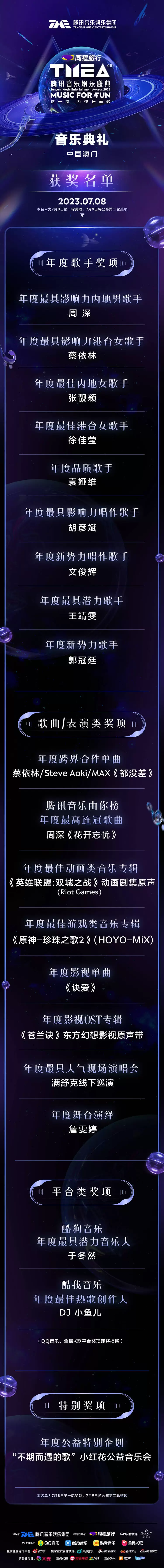 2023TMEA云集备受欢迎的国际化艺人阵容,打造高品质的演出舞台。在本次盛典总冠名同程旅行的支持下,TMEA 将与同程旅行一起,陪伴乐迷尽情探索音乐世界,感受旅行快乐,让每一次的欢聚都变得有意义。为了让更多乐迷感受音乐典礼的现场盛况,腾讯音乐娱乐集团旗下QQ音乐、酷狗音乐、酷我音乐、全民K歌四大平台进行线上呈现。