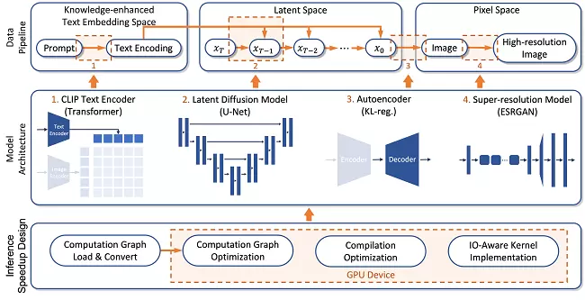 Text-to-Image Synthesis(TIS)是指根据文本输入生成图像的技术,给定一段文本指令,使用计算机程序生成符合文本内容描述的图像。然而,由于预训练语言模型缺乏特定领域的实体知识且受限于扩散模型的推理速度,目前开源社区的流行文图生成模型难以支持特定工业领域的应用。主要问题在于,基于扩散的方法需要使用预训练文本编码器对输入文本进行编码,然后作为扩散模型的UNet模型的条件输入。但是目前使用网上收集的文本图像对预训练的文本编码器模型缺乏特定实体概念的理解能力,难以捕获特定实体知识,这对于生成逼真的实体对象图片至关重要。同时,扩散模型的推理速度和计算成本也是需要考虑的重要因素,而迭代逆扩散去噪过程的繁琐计算一直是扩散模型推理速度的瓶颈。我们提出的新框架用于训练和部署文图生成扩散模型,模型架构如下图所示。为了提升对特定实体的理解能力,我们在CLIP的文本编码器中注入了丰富的实体知识,使用知识图谱进行知识增强。与开源Stable Diffusion直接利用大规模分层扩散模型不同,我们在图像扩散模块之后集成了一个基于ESRGAN的网络,以提高生成图像的分辨率的同时有效解决了参数量爆炸和耗时长的问题。对于在线部署,我们基于FlashAttention优化的神经架构设计了一个高效的推理流程。生成模型计算图的Intermediate Representation(IR)经过端到端人工智能编译器BladeDISC进一步处理,以提高生成模型的推理速度。