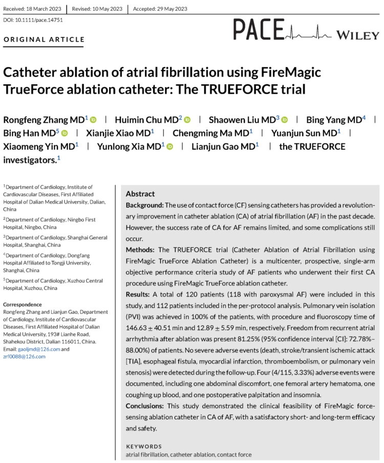 TrueForce压力导管上市前临床研究结果近日首次刊登于《起搏与临床电生理学》(Pacing and Clinical Electrophysiology,PACE),总共收集了120例TrueForce压力导管的临床应用,由来自国内五家三甲医院的多名电生理专家共同完成。来自上市前临床研究的组长单位-大连医科大学附属第一医院的张荣峰教授对临床结果做了详细解读,并表示TrueForce压力导管作为国产首款压力导管,在临床试验阶段就已经展现出了媲美进口品牌的实力。