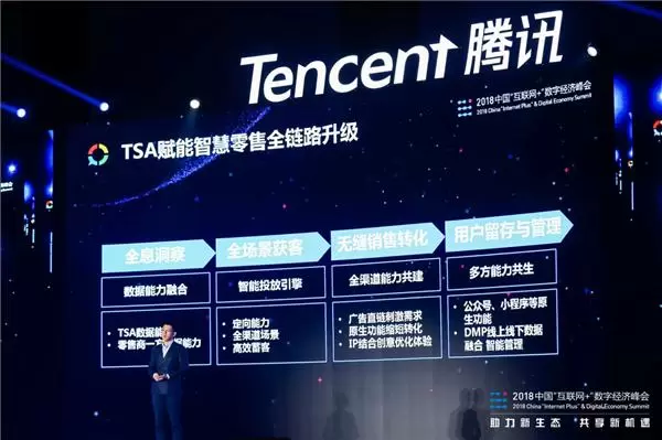 4月12日,主题为“助力新生态,共享新机遇”的2018中国“互联网+”数字经济峰会在重庆召开。腾讯公司董事会主席兼首席执行官马化腾在题为《互联网+助力数字中国建设》的演讲中,将社交广告列为腾讯数字化工具箱的“七种工具”之一,其打通线上线下进行一体化营销的效果得到了越来越多广告主的认可。在当日下午举办的“智慧零售”分论坛中,腾讯社交广告高级总监卢成麒带来了题为“智能营销助力智慧零售”的主题演讲,系统地阐述了社交广告在智慧零售全链路升级中所起到的作用,并与分论坛嘉宾分享了以数据为引擎提效线下零售的品牌应用实例。