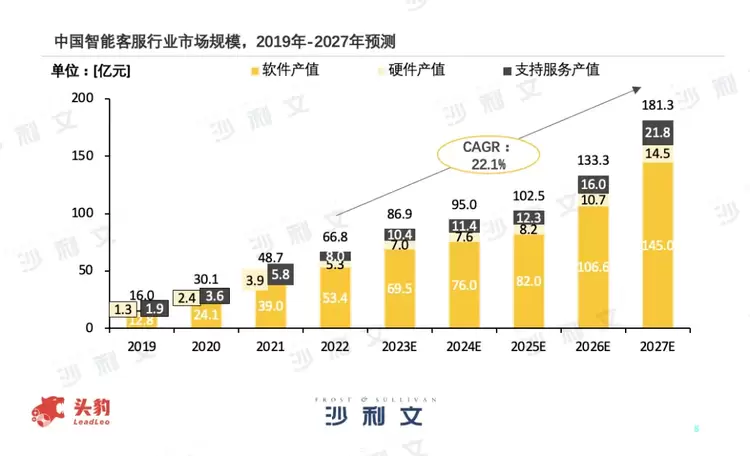 沙利文报告显示,中国智能客服行业以智能客服软件为主导,约占市场份额的80%。2022中国智能客服市场规模达到66.8亿元,随着智能客服应用场景边界的不断扩展,预计到2027年,市场规模有望增长至181.3亿元;