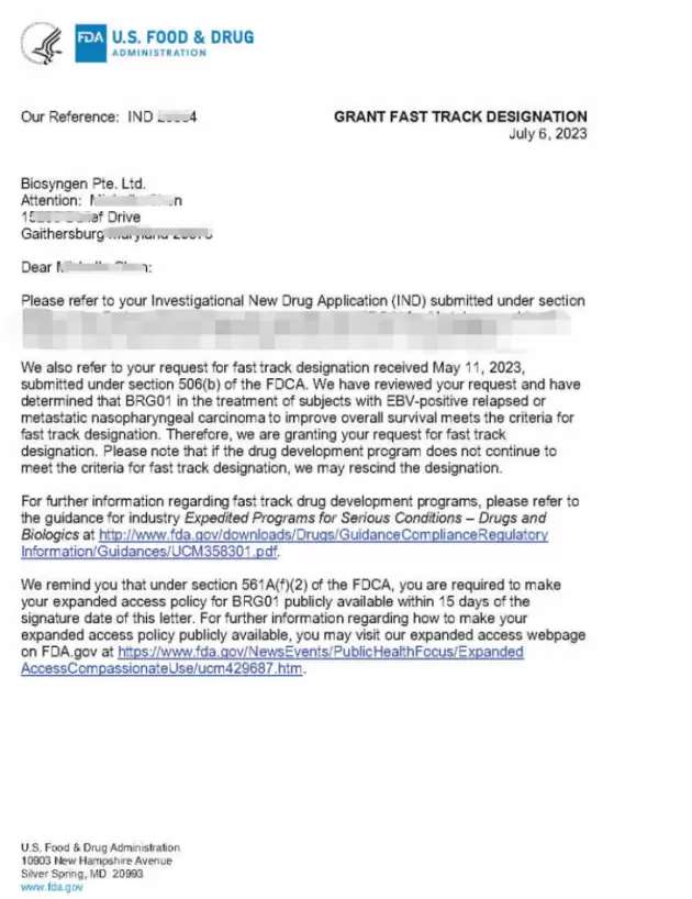 美国时间2023年7月6日,百吉生物收到美国FDA正式书面回函,其全球首创的针对鼻咽癌免疫细胞治疗药品BRG01被授予“快速通道资格”(Fast Track Designation, FTD),用于治疗复发/转移性鼻咽癌。