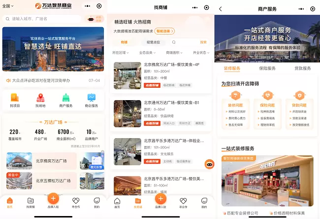 商户可以通过万达智慧商业平台实时连接全国万达广场的各类空间资源和服务资源。在选址和租铺方面,万达商管将全国近500座万达广场优质铺位及经营点位、活动场地等搬到了线上,用户可以通过万达智慧商业平台便捷搜索全国万达广场的各类空间资源,并实时联系服务顾问进行咨询。借助AI和大数据分析能力,平台能够快速匹配适合的铺位,无论是新品牌首店还是老商户拓展新店,都能轻松找到理想的铺位。这种融合了“AI智能+专家顾问”的服务模式,将理性的数据智能与有温度的人工服务相结合,成为服务升级的亮点。在开店和经营方面,除了常规的营运服务和营销帮扶,万达商管还通过严格筛选符合“万达标准”的高品质装修公司、国内头部保险公司等生态合作伙伴,创新推出商铺装修、商户保险、商户人才服务等一体化增值服务。为商户创建完整的服务通道和标准化服务流程,确保商户开店经营更加安心。