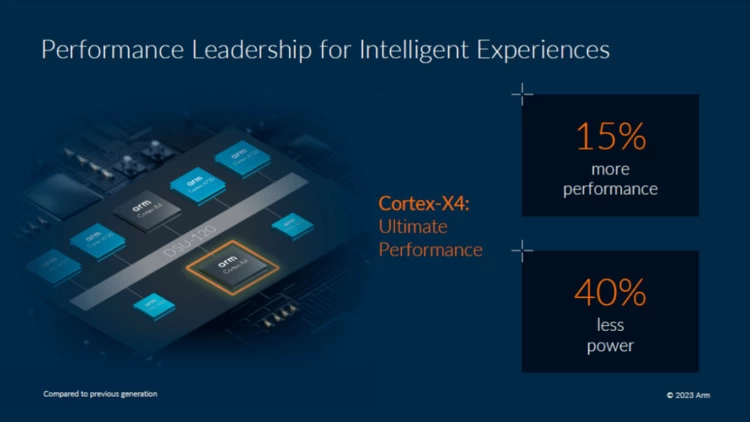 根据Arm公布的信息来看,基于Armv9的Cortex-X4超大核再次突破了智能手机的性能极限,相比X3性能提升15%, 基于相同工艺的全新高能效微架构可实现功耗降低 40%。而Cortex-A720将成为明年主流的大核,可提高移动芯片的持续性能,是新CPU集群的主力核心。
