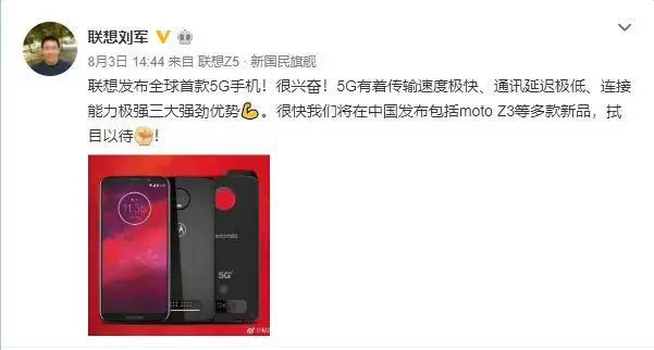 联想发布全球首款5G手机!刘军:moto z3等多款新品很快在中国发布