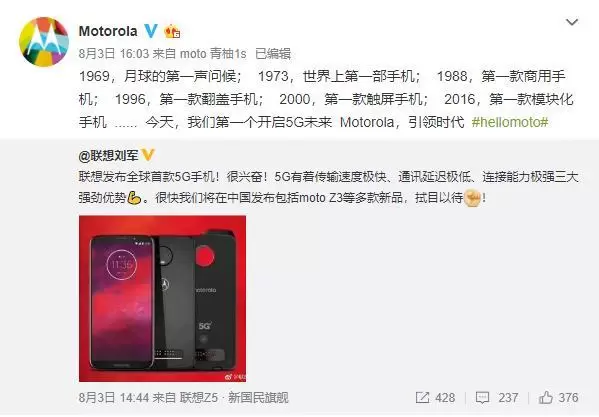随后Motorola官微也转发了刘军的微博,进一步确认了moto z3即将在中国区上市的消息,同时还回顾了Motorola的发展史:1973年,世界上第一部手机由Motorola发布,改变了整个世界通讯史;2016年,世界上第一款模板化手机诞生于Motorola,让手机个性化、定制化成为可能;2018年,世界上第一部5G手机由Motorola首发,新时代的通信拉开序幕。