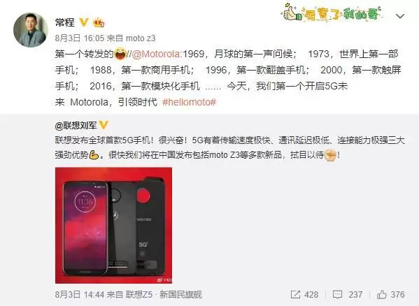 联想MBG中国区负责人,号称"掌柜"的常程随后使用moto z3转发了Motorola的微博,看来,离国内上市真的不远了。