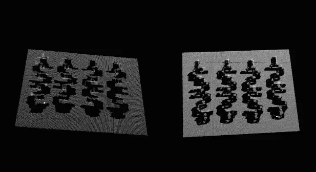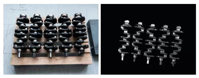 曲轴“弯曲”“阴影”“重噪”的特点是3D工业相机成像难点,普通工业相机难以精确识别曲轴,成像误差给机械臂抓取作业带来一定的干扰。某汽车零部件厂曲轴工件重量较大,传统人工抓取上料效率低,因此计划进行产线智能改造,迁移科技激光3D相机成功在环境光干扰的情况下,完成了对曲轴的视觉识别。