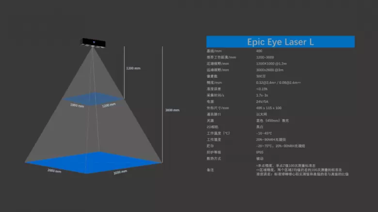 Epic Eye Laser L 相机具备大视野,可以实现近距离覆盖更大的垛形;针对工业生产中常见的大尺寸工件、大垛型麻袋、纸箱、周转箱等提供清晰的识别和定位。相机单点精度为0.32mm@2.4m、区域精度为0.08mm@2.4m,精度性能业内领先;采集时间为1.7s(受实际环境及工件材质影响),速度快,分辨率高。