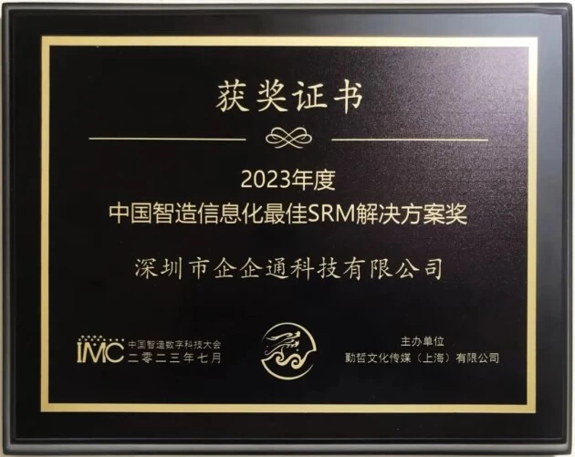 企企通荣膺“2023年度中国制造信息化最佳SRM解决方案奖”,赋能智能制造行业数字化采购转型