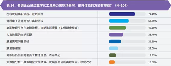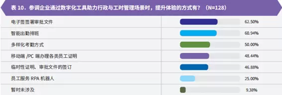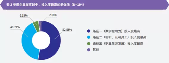 值得注意的还有,超一半的参调企业表示在实践中,投入度最高的做法是利用数字化工具便捷员工,快速处理问题,提高效率,提升员工满意度。