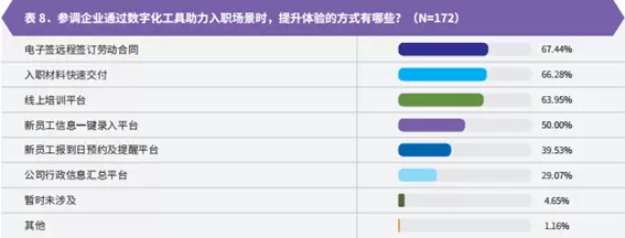其次,在入职方面,电子签凭借在远程、无纸化签署方面的出色表现,以 67.44% 牢牢占据“企业在入职场景中使用最多的数字化工具”这一地位。