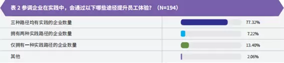 目前,企业提升员工体验的方式已经日趋多元,对于提升员工体验的三大路径,近8成企业表示均有涉及,使用两种及以上路径的企业达到了84.54%。