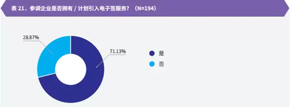 值得一提的还有,在本次参调企业中有超过7成的企业拥有/计划引入电子签服务,可见如今的市场环境对电子签的高度认可。