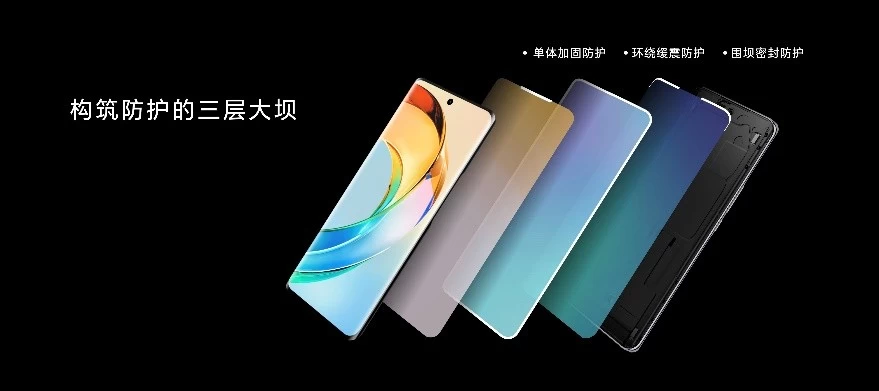 调查数据显示,用户平均每年手机意外掉落的次数约为7次。为了降低手机意外跌落时的损伤,给广大消费者更可靠、更抗摔的手机使用体验,荣耀X50创新升级材料工艺,借鉴水利工程技术原理,首创太极缓震架构,从“点”出发,在屏幕正面进行单体加固;由“线”切入,在屏幕四周进行环绕式加固,在手机跌落过程中,通过自身形变吸收冲击力;最后在机身内部将所有细小的元器件牢牢固定,由外到内,由表及里,构筑起整机防护的三层大坝。