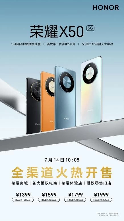 2023年7月14日,荣耀X系列十年登峰之作——荣耀X50全渠道火热开售,首销价1399元起。荣耀X50是全球首个获得瑞士SGS整机五星抗跌耐摔认证的产品,十面抗摔,无惧跌落;1.5K超清护眼硬核曲屏,全心护眼、带来跃级视觉体验;搭载5800mAh超耐久大电池,电池寿命够长,电量久用不衰;首发第一代骁龙6移动平台,4nm先进制程工艺带来强劲性能体验;16GB+512GB超大双存,多任务处理能力、后台APP保活率大幅跃升。