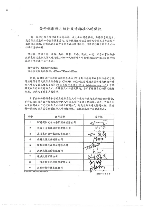 7月7日,天合光能等9家组件企业代表经过充分及深入地沟通,对新一代矩形硅片中版型组件尺寸标准化达成了共识: 2382mm*1134mm。同时,9家企业还倡议行业现行的以及未来的182系列组件与210系列组件尺寸设计应遵循中国光伏行业协会标准《T/CPIA 0003-2022地面用晶体硅光伏组件外形尺寸及安装孔技术要求》中的规定以及行业现有的尺寸。