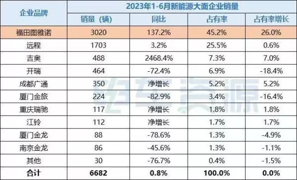 电车资源数据显示:6月份新能源大面销量再创今年以来新高!1-6月新能源大面销量实现“五连涨”。图雅诺新能源作为大面车型(7m³以上)代表,毫无悬念的再次斩获单月销量冠军和上半年销量冠军。