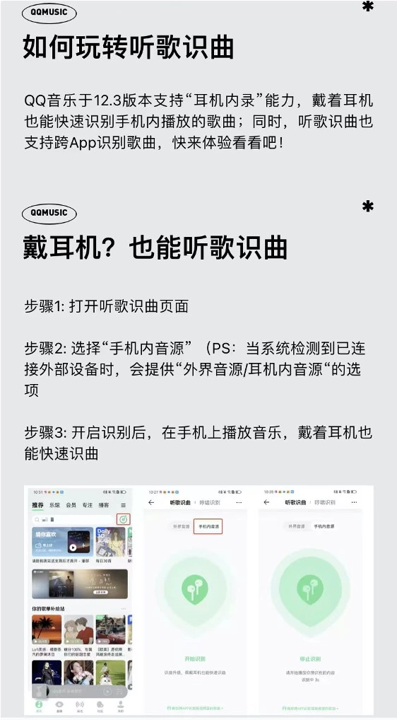 「听歌识曲」是QQ音乐备受赞誉的一项功能,精准的识曲能力最快3秒一首歌的识别速度让其在国际大赛中频获大奖。这一次,「听歌识曲」再升级,增加了"耳机内录"功能,即使在佩戴耳机的情况下也能快速识别手机内的歌曲。值得一提的是,"耳机内录"也可支持跨应用识曲,无论在何应用中播放音乐或视频,都能实现精准识曲,为用户带来更高效便捷的音乐识别体验。