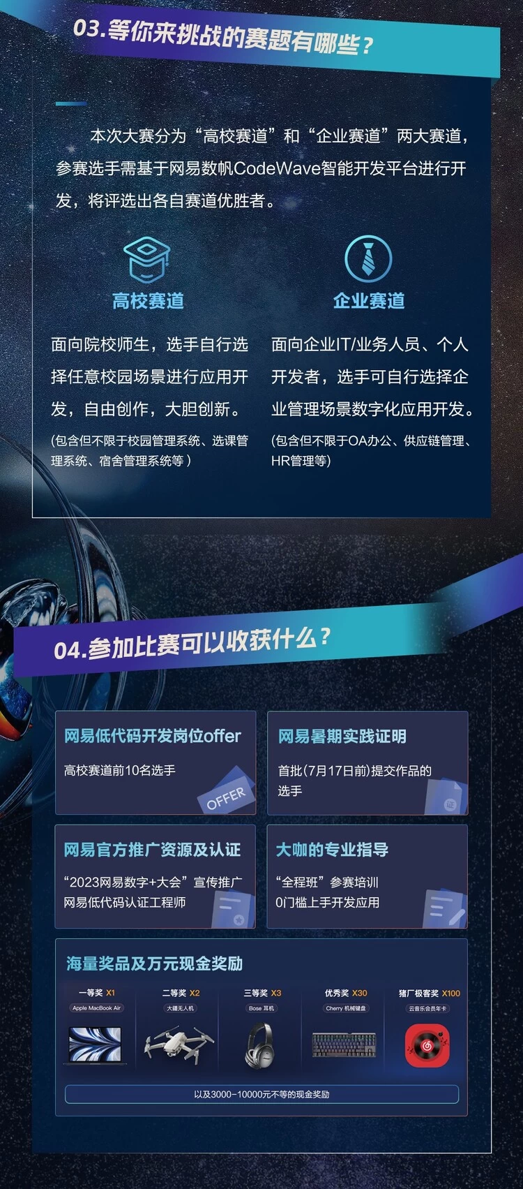 不只是收获一次宝贵经历,参赛选手更有机会获得丰富好礼—— Apple MacBook Air、大疆无人机、Cherry 机械键盘、HUAWEI 智能音箱等,最终成绩前十名的高校赛道选手还可获得网易工作机会,成为一名真正的低代码开发工程师。别再犹豫,快来参加吧!