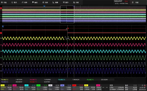 ·三相交流电分析,三相交流电广泛应用于需要高能效或大功率的机电设备,如三相逆变器、电机、驱动器等。逆变器广泛应用于家电、太阳能光伏发电、风能发电等,而在诸多汽车系统中,主驱、水泵、油箱冷却系统都是由三相电所控制,对这些设备进行功率分析和电能质量测量必不可少。使用SDS6000 Pro分析三相电时,其中3路接高压差分探头测量电压,3路接电流探头测量电流,这样不仅能直接观测到实时波形,还能利用数学运算进行各种信号处理得到电流有效值、视在功率、波峰因数、谐波失真等参数。