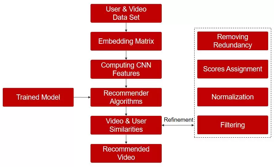 推荐算法与个性化推荐:通过训练好的模型,可以利用其学习到的特征和模式来进行视频推荐。根据用户的历史行为和偏好,通过计算用户与视频之间的相似度来进行个性化推荐。根据相似度计算结果,为用户生成一个视频推荐列表,并根据用户的反馈和评分进行迭代优化。