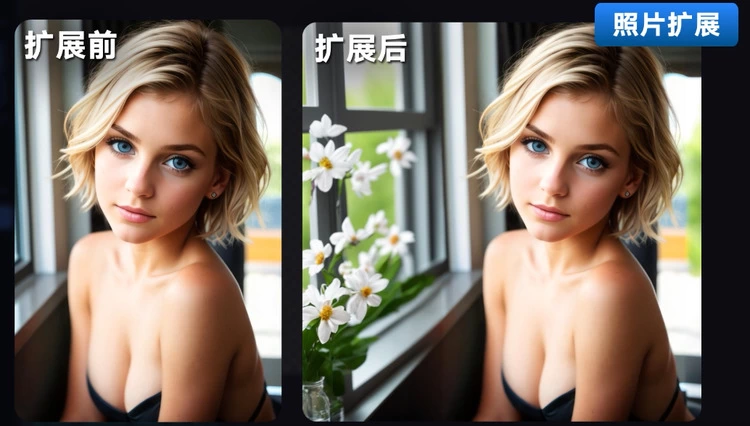 除此之外,海艺AI还拥有独特的“智能补图”功能,使用者只需拖入图片,就能在同一张图片的边界延伸空白,并利用 AI绘图生成图片内容,同时还能针对填入文字指令对新的区域进行补充。