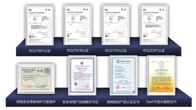 多年来,法大大努力为企业及个人客户提供较纸质合同更为出色的安全保障。早在2016年,法大大便获颁了信息系统安全等级保护备案证明(第3级)以及信息安全管理体系认证证书(ISO27001),并陆续取得了隐私信息管理体系证书(ISO27701)、公有云个人信息保护管理体系证书(ISO27018)、业务连续性管理体系证书(ISO22301) 以及可信云认证证书(企业级saas服务)等,并逐年接受监督审核,持续优化安全体系。