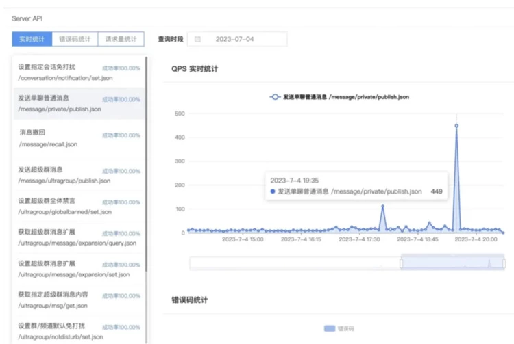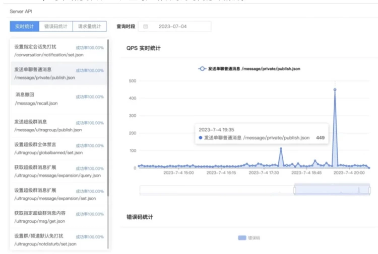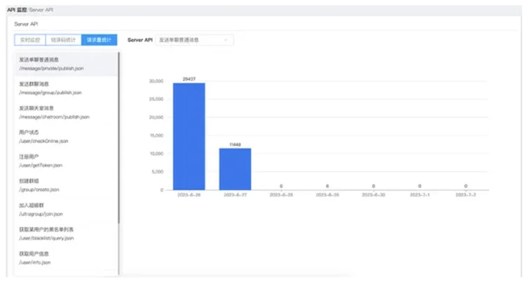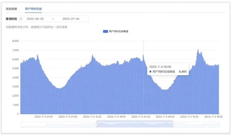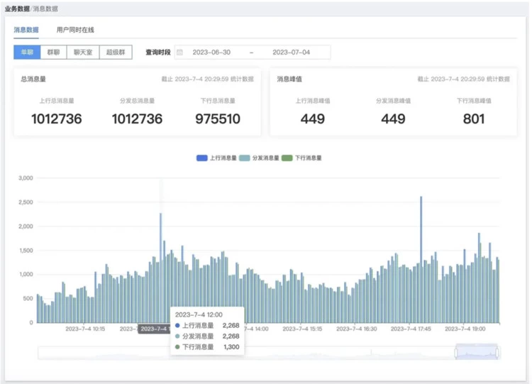 通过这些业务数据监控,开发者可感知到各会话类型、各时段的消息量,可查看每日用户同时在线分布趋势,从而为运营策略调整提供指引。