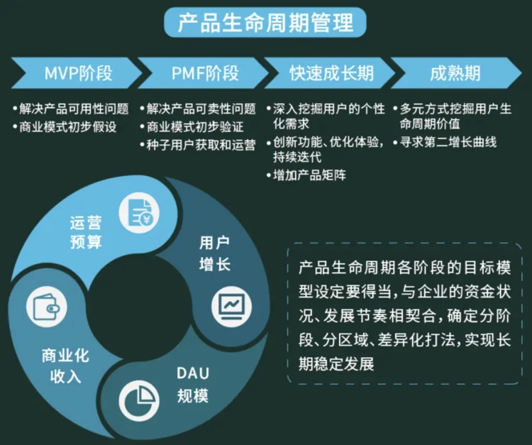 根据融云《社交泛娱乐出海作战地图》,产品全生命周期至少包括MVP、PMF、快速成长期、成熟期等几大阶段,而每个阶段都有必须解决和优化的核心问题,需要付出相当的精力和资金。