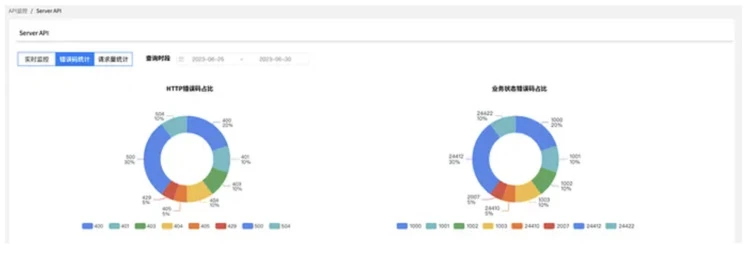 错误码统计:可查看过去 7 天的 Server API 的错误码占比情况,包含 HTTP 错误码占比及业务状态错误码占比统计。