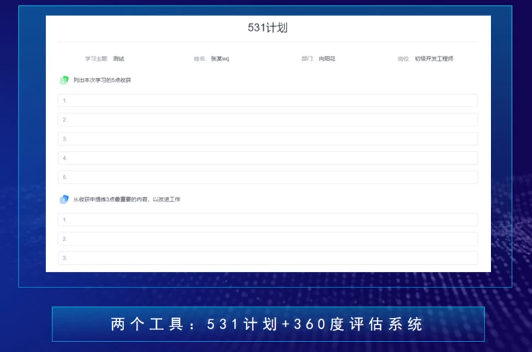 最后是需要借助两个工具实现培训内容真正落地的问题。一是EduSoho企培系统的“531计划”,该计划要求员工在培训后对培训内容进行复盘,并建立个人的改进计划。通过在培训项目中嵌入531计划,员工需要在预设检查日期内完成1点实践计划的承诺目标,并由相关业务负责人不定期追踪员工实际工作情况,以推动培训内容的落地和行为改变。另一个就是阔知即将引入的360度评估系统,通过邀请直接管理者、下属或业务相关同事对员工的行为改变或绩效结果进行评估,实现培训效果的可追踪和可视化,真正提升绩效和业务发展。