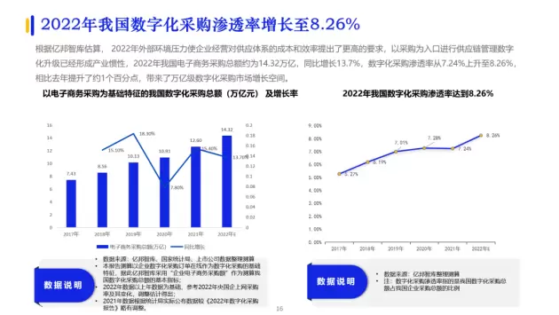 围绕2022年我国数字化采购生态,亿邦智库在报告中指出,2022年外部环境压力使企业经营对供应体系的成本和效率提出了更高的要求,以采购为入口进行供应链管理数字化升级已经形成产业惯性。2022年我国企业采购规模超过173万亿元,电子商务采购总额为14.32万亿元,数字化采购率升至8.26%,我国数字化采购市场发展动力充足。