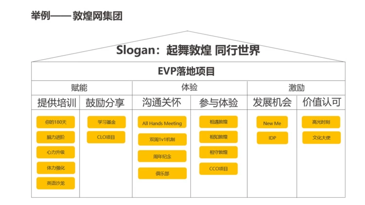 其三,雇主价值主张。雇主价值主张EVP是雇主品牌建设的顶层设计,在企业雇主品牌建设中起到统领全局的作用。白皮书中以敦煌网集团为例,介绍了EVP体系的实操。