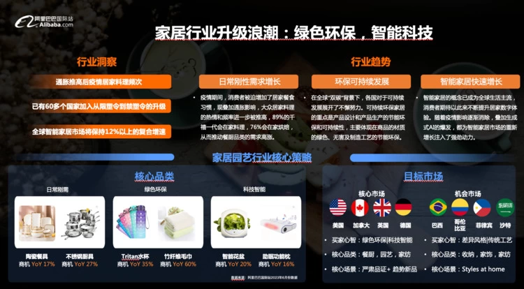 “整体家居行业正在迎来绿色环保、智能科技的升级浪潮。日常刚性需求增长、环保可持续发展、智能家居快速增长正在成为三大趋势。”在阿里国际站佛山大居家产业带发布会现场,阿里国际站建材行业负责人葛明做了趋势机会和品类规划解读,目前在阿里国际站上,Tritan水杯、不锈钢厨具、智能花盆、陶瓷餐具、智能马桶、人因照明等趋势商品为行业带来全新的增长动力。