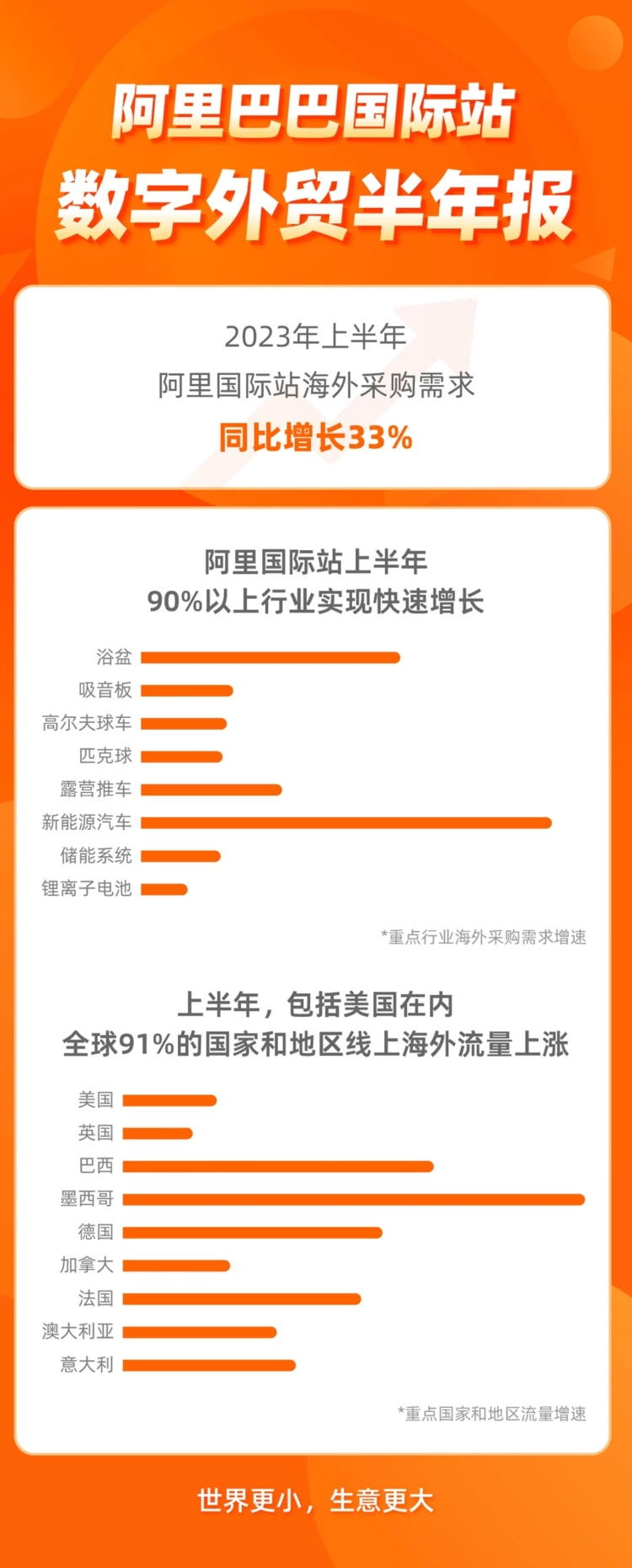 近期,阿里国际站发布数字外贸半年报显示,2023年上半年,海外线上需求同比增长33%。在各个出口行业、外贸市场,数字化已成当前最大趋势。据悉,阿里国际站上半年90%行业线上出口快速增长,91%的海外市场线上流量上涨,不仅东南亚等新兴市场继续高速增长,欧美等传统外贸市场也回到了增长轨道。