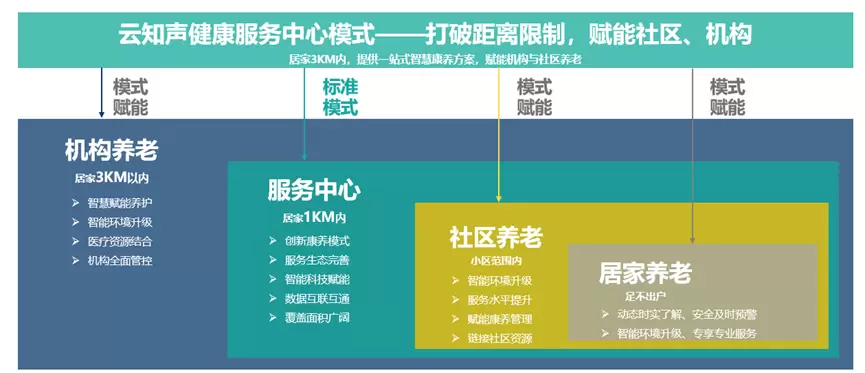 云知声健康养老服务可围绕居家老人3公里内自建服务中心,也可结合社区养老与机构养老特色,定制化赋能模式,智能升级改造,充分盘活与升级已有康养服务能力,更智能地为老人提供康养服务。