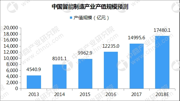 在2010年,中国制造业产值达到1.955万亿美元,在全球制造业总产值中所占的比例为19.8%,超过美国1.952万亿美元的总产值,此后中国制造业产值高居全球第一。随着制造业智能化的升级改造,我国智能制造产业呈现较快的增长。2017年,中国智能制造产业产值规模将近15000亿元,预计到2018年产值规模将超17480亿元。