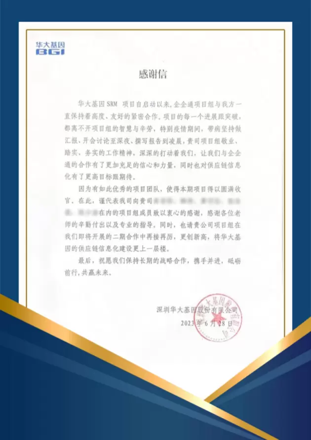 自华大基因SRM项目启动以来,企企通团队项目、技术、实施等部门人员秉持担当、敬业的精神,从初步调研、深入讨论、调整方案、反馈测试、落地实施、交付验证等各阶段,给予了很多专业意见,并提供了及时高效的技术支持和服务,护航华大基因SRM项目进入关键突破期,在企企通的高度重视和配合、项目组全体人员共同努力下,与华大基因的共同合作下,最终顺利完成项目的验收与上线。为此,华大基因向企企通团队发来了暖心感谢信。