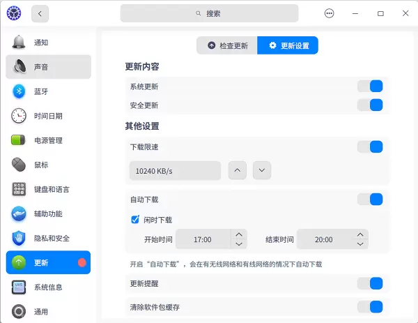 在控制中心-更新-更新设置模块,支持自行设置自动下载更新的时间段以及下载速度。