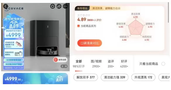 在刚刚结束的618 中,科沃斯以15亿的总成交额在扫地机器人品类大获全胜,蝉联第一。其中五月底刚上市的高端旗舰地宝X1S PRO,在短时间内迅速成为今年618期间全渠道第二名。大促已过,但地宝X1S PRO在电商平台上依然保持着稳定热度。京东平台可见,该产品评价人数在10000+,好评率稳定在98%,在清洁、避障、地图规划等扫地机器人核心能力上,都收获了接近满分的评分。