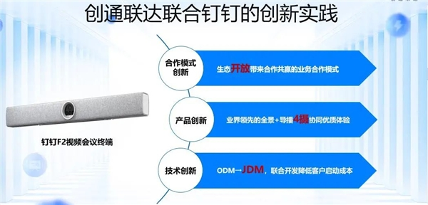 创通联达作为全球领先的智能物联网产品和解决方案提供商与钉钉于2021年初展开合作,并共同开发出了视频会议一体机F2。该产品基于高通8250平台打造,汇聚了创通联达在系统架构设计与开发、相机调优以及扩展性应用开发等方面的技术优势以及钉钉在产品基础定义、ID设计、算法开发等方面的积累,可为用户提供单机10米远距离清晰拾音、4K级高清画质和智能导播等能力。目前该产品已在海外市场进入大规模量产阶段,销售区域覆盖全球20多个国家和地区,且销量大幅度超过预期。