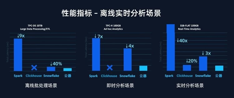 在批处理和实时分析场景上,云器 Lakehouse 在多种标准 benchmark 上比主流开源和商业产品快 3-9 倍。