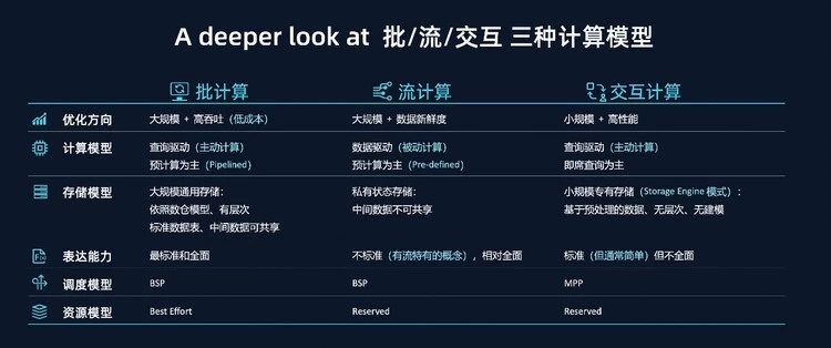 这些问题困扰业界多年,很多产品和企业也尝试解决这些问题。由于流处理和批处理的计算模型、数据驱动方式以及存储系统设计均不同;批处理和交互分析的计算模型、存储模型、调度模型、资源模型也不同。因此,企业想要统一离线、实时和交互分析变得尤为困难。