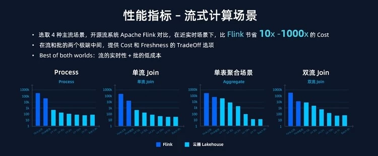 流式计算方面,在 Process、Aggregate、单流 Join 和双流 Join 四种主流场景下,云器 Lakehouse 相比开源流系统 Apache Flink 做到了更灵活的调节能力,并在近实时场景下,比 Flink 有 10 倍—1000 倍的成本节省。