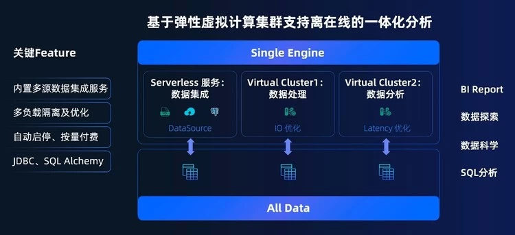 云器 Lakehouse 在湖仓一体和 Single-Engine 的基础上,基于弹性虚拟计算(Virtual Cluster)支持离在线的一体化分析,可以实现开箱即用、秒级弹性资源、按量付费。